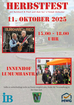 Am Samstag, 11.10.2025, feiern der Bürgerverein Nord, die MWG und das Stadtteilmanagement den Herbst. Auf dem Hof der Lumumbastraße werden von 15 bis 18 Uhr einige Leckerbissen präsentiert. Von 15 bis 17 Uhr werden Burkhard und Fred aufspielen, anschließend rundet das Sax`n`Anhalt Orchester die musikalischen Klänge ab. NIcht nur Musik wird in vollen Zügen für eine gemütliche Atmosphäre sorgen. Erstmals wird Friends Events eine Veranstaltung im Magdeburger Norden bereichern. Eine junge Firma mit jungen Leuten wird für die Kinder einige Angebote bereithalten. Freut euch auf Kinderschminken, Glitzer-Tattoos, Buttons, Jenga oder Riesenmikado. Gepaart mit dem Bastelstand und den weiteren Spielangeboten des Bürgervereins dürften die Kinderherzen höher schlagen. Für Speis und Trank sorgt der Bürgerverein und alle zusammen freuen sich auf einen bunten und fröhlichen Herbsttag.